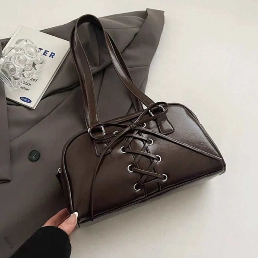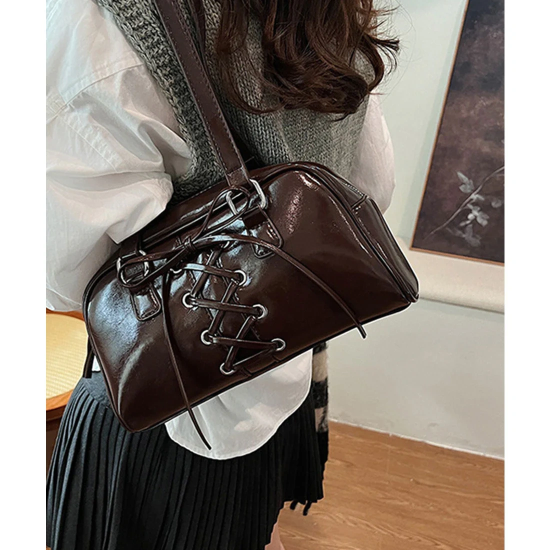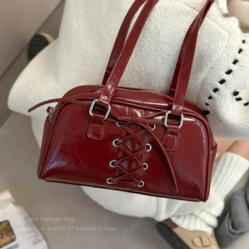 Infuse your look with a touch of "Coquette-Core." Our Lace-Up Patent Bowler Bag takes a classic boxy silhouette and elevates it with intricate, corset-inspired ribbon lacing across the front. Crafted from premium, high-gloss patent leather, this bag offers a structured shape that provides more internal volume than a traditional baguette, making it as practical as it is stylish.