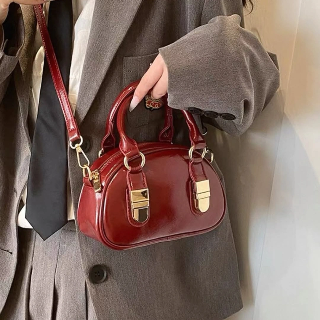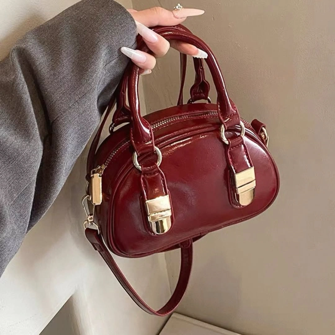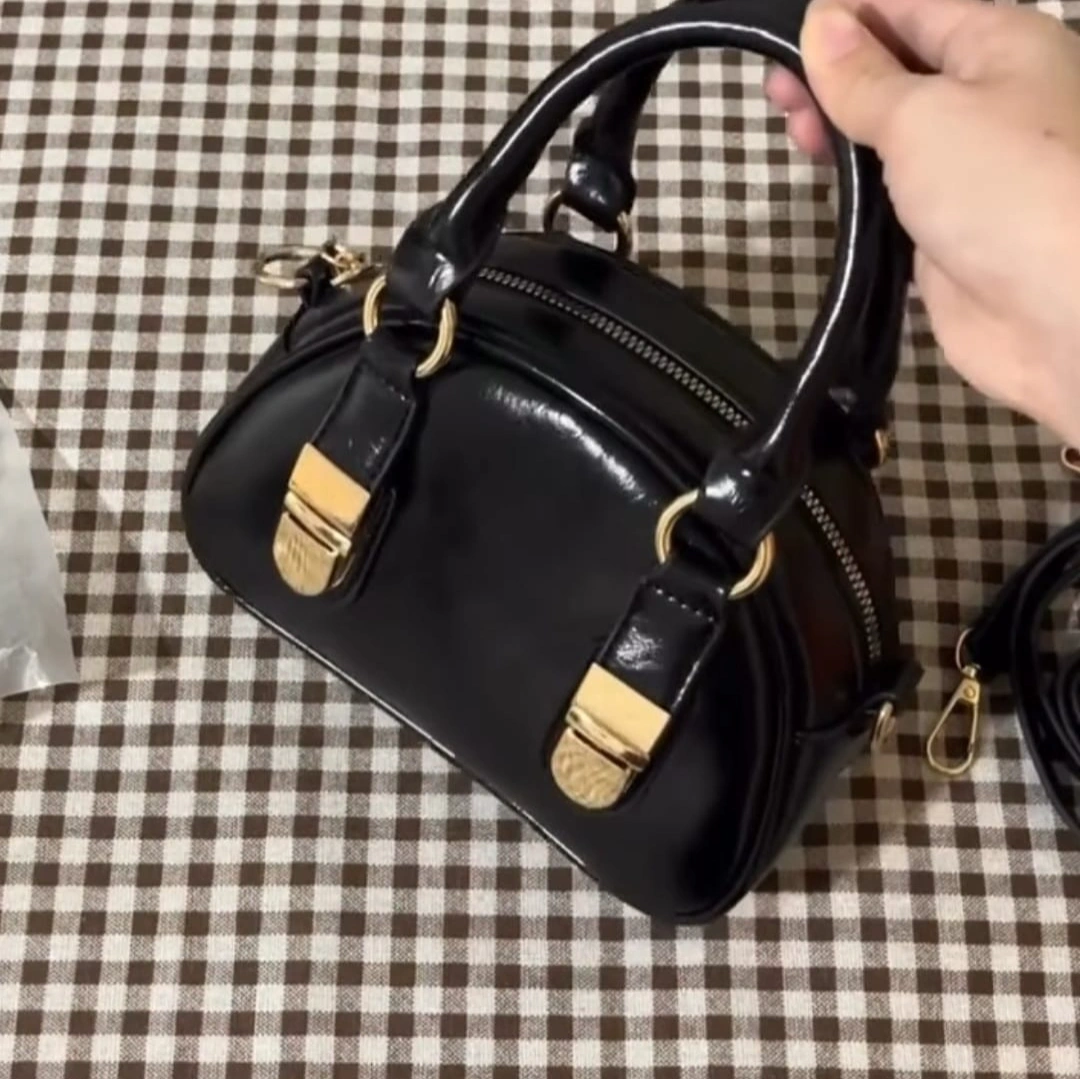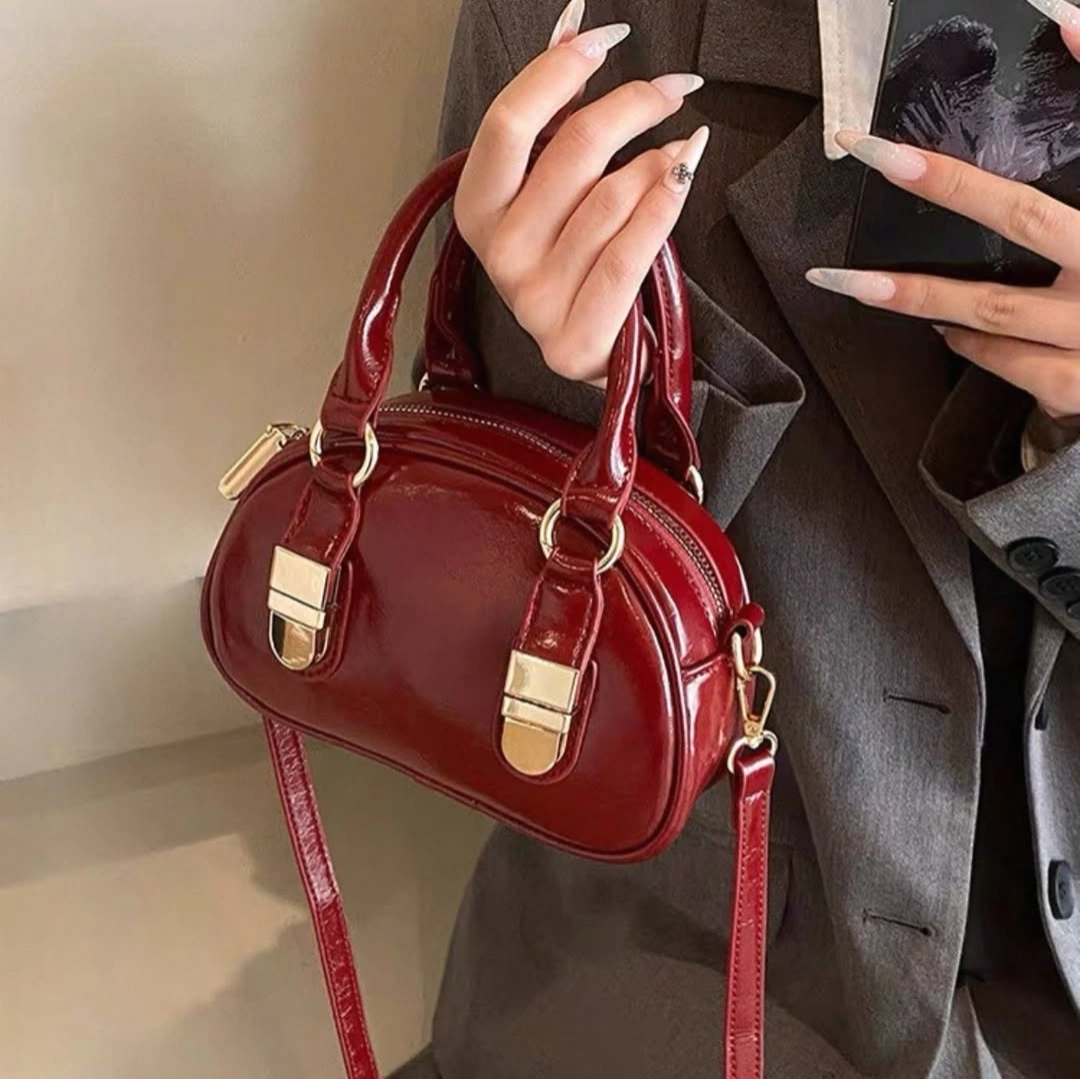 Add a touch of retro-inspired flair to your accessory game with our Mini Patent Boston Bag. This piece reimagines the classic doctor-bag silhouette in a modern, miniature scale. Crafted from high-gloss patent leather, it features a unique curved top and prominent metallic "belt-tip" accents that give it a structured, luxurious feel.