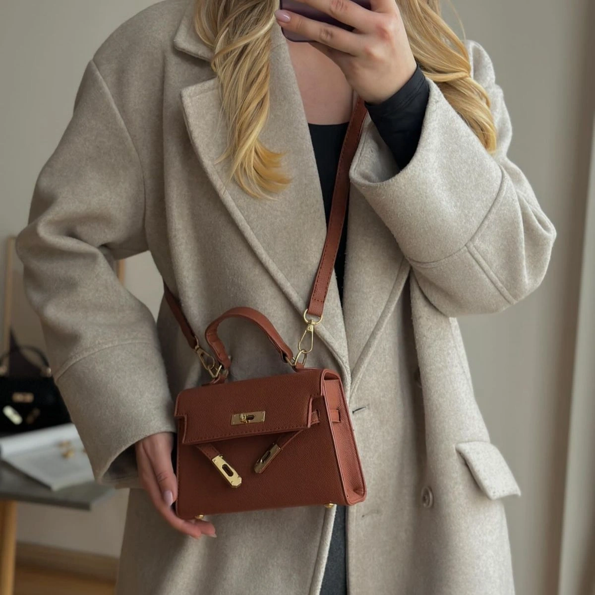 For a "Clean Girl" office look, pair this tan trapeze bag with an oversized white button-down, tailored beige trousers, and gold jewelry. It also pairs beautifully with a navy floral sundress for a polished weekend ensemble.