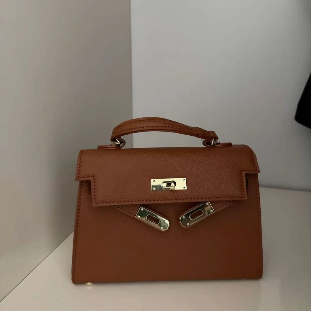 Redefine your professional wardrobe with our Structured Trapeze Top-Handle Bag. This piece features a sophisticated flared silhouette that provides a firm, architectural presence. Crafted in a versatile warm tan, it is accented with polished gold-tone hardware and a secure twist-lock closure.